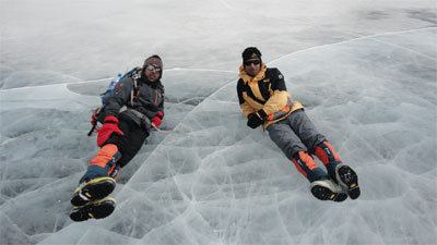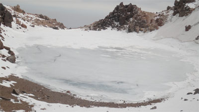 به سمت قله حركت كرديم و پس از نيم ساعت ودر مجموع بعد از شش و نيم ساعت كوهنوردي سنگين به قله و درياچه زيباي سبلان رسيديم و براي دومين بار در اين سال پرچم پر افتخار كرمانيها در يكي ديگر از قلل خطه سر افراز اذر بايجان به احتزاز در امد. درياچه كالا يخ زده و بيشتر ان نيز پوشيده از برف است . چند دقيقه اي را مبهوت زيبايي ان ميشويم . سرعت باد در ان مكان كمتر است . بر روي درياچه يخ زده كه يخ خيلي قطوري هم داشت قدم زده و دور تا دور ان را پيمايش ميكنيم.